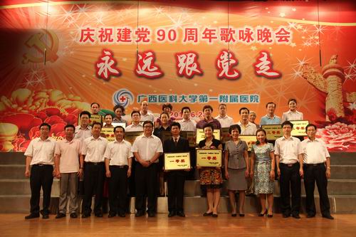 6月28日晚,广西医科大学第一附属医院“永远跟党走”——庆祝建党90周年歌咏晚会在学校图书馆演讲厅隆重举行。第一附属医院赵劲民院长,党委杨连招书记、叶凤副书记,副院长肖常青、刘志明、罗杰峰、伍伟锋、曾志羽,第一临床医学院学生党总支书记黄佳、副院长罗佐杰等院领导出席晚会。