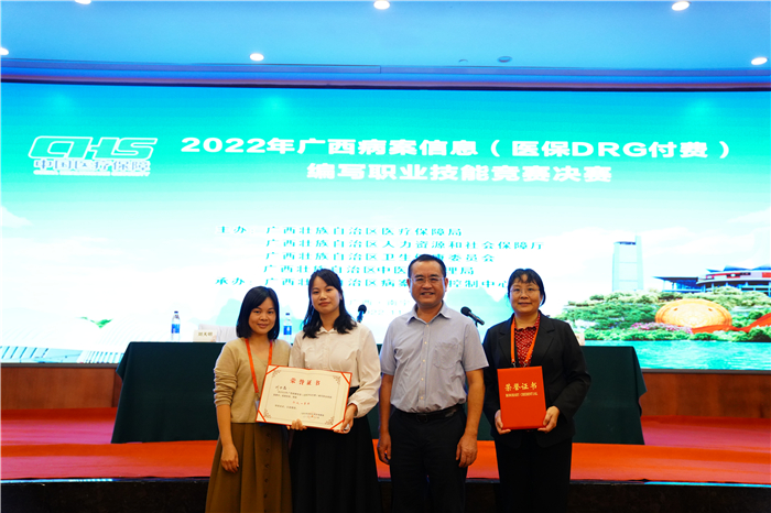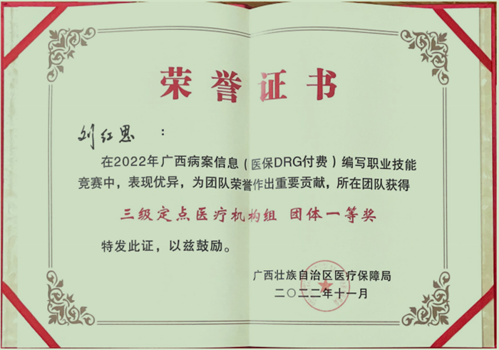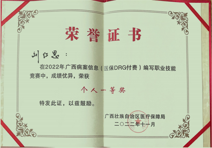 为推动病案编码人才队伍建设,持续提升住院病案首页数据质量,11月3日至4日,由自治区医保局、自治区人力资源社会保障厅、自治区卫生健康委、自治区中医药局联合主办,我院承办的“2022年广西病案信息(医保DRG付费)编写职业技能竞赛”在南宁举行,来自全区15个统筹地区30支参赛队伍的92名选手同台竞技。最终,我院病案信息管理科刘红思勇夺第一名,所在的区直二队荣获团体一等奖。