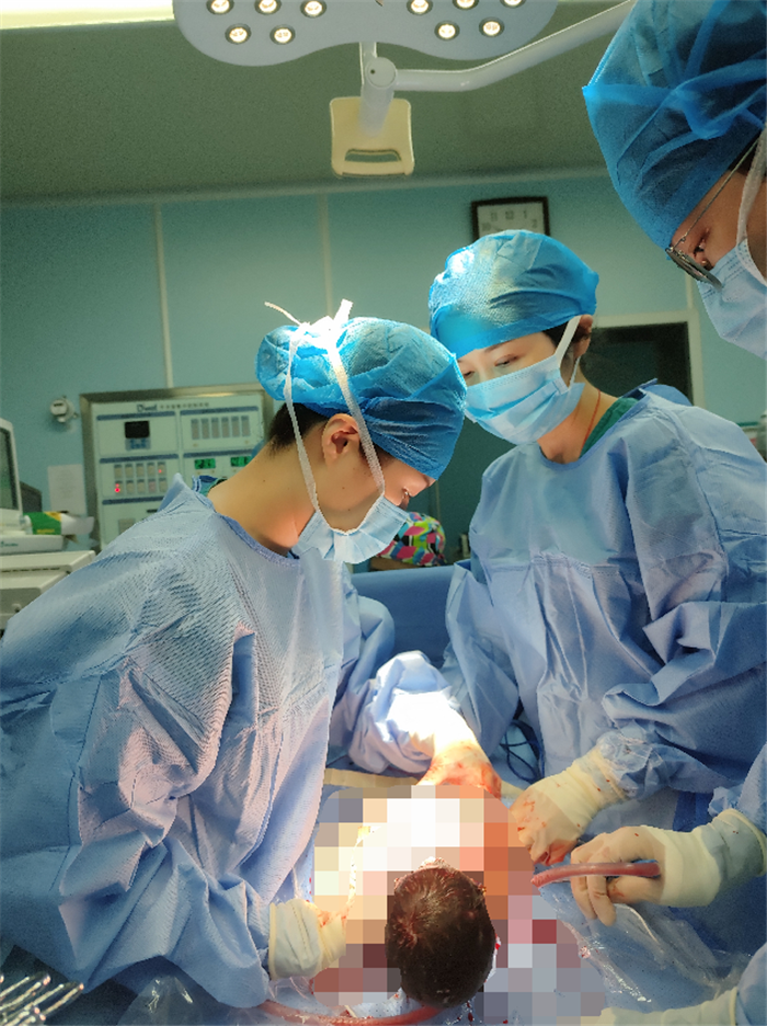 无影灯下,联合手术正在紧张进行中。当天14时48分,一个鲜活的小生命顺利剖宫产娩出。产科曾雅畅主任医师迅速止血缝合子宫切口后,陈军莹主任医师立即开始行宫颈癌根治术。