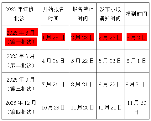 为了提高进修学员学习效果,规范进修流程,我院每年3月、6月、9月、12月分别招收四批进修人员,具体2026年招生时间安排如下: