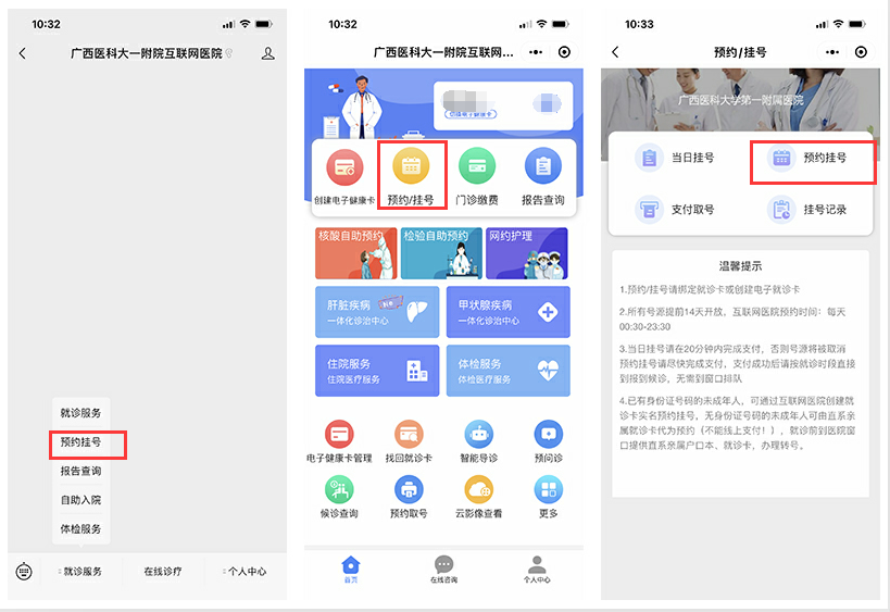 “就诊服务”—选择“预约挂号”—“当日挂号/预约挂号”—选择门诊种类——依次选择科室、医生、时间、号源,进行预约挂号。