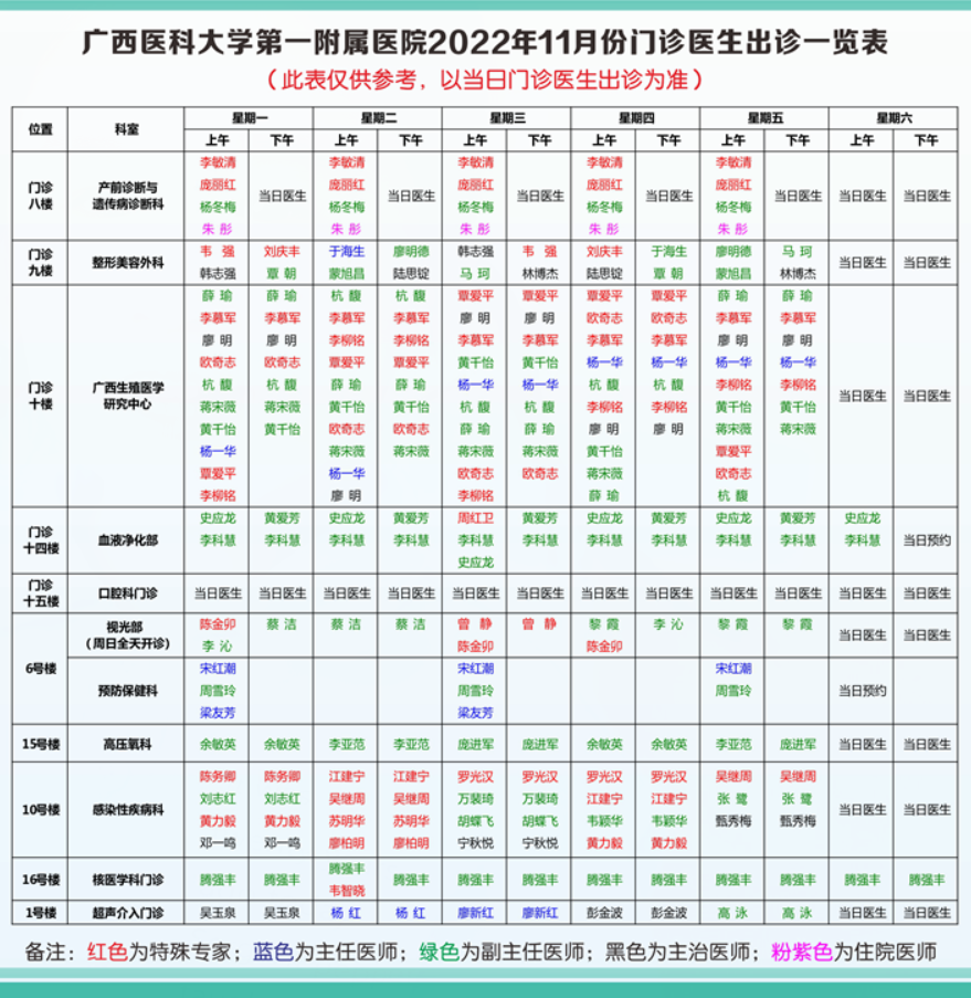 6.产前诊断与遗传病诊断科、整形美容外科、广西生殖医学研究中心、血液净化部、口腔科、视光部、预防保健科、高压氧科、感染性疾病科、核医学科、超声介入门诊