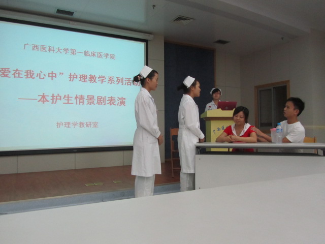 其次,2008级护理学院本科实习生进行了“爱在我心中”情景剧表演。表演的内容、形式和编排全部由同学们精心准备,剧情生动、表演的方式灵活多样,充分融入了学生的情感体验,发挥了同学们的想象力和创造力,通过角色互换及情感体验让学生深刻体会患者的需求及内心感受。