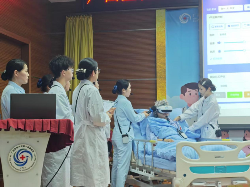 本次教学查房以“基于OBE理念、运用PBL教学模式结合AI技术的一例老年脑梗死患者的护理”为主题,由老年医学神经内科护理团队主持,于丽琴、卢薪宇老师带教,来自广西医科大学、广西中医药大学的7名实习护生全程参与。查房前,教学团队通过情景演练导入病例,明确查房目标,聚焦脑梗死患者护理问题识别、个性化护理措施制定及康复训练相关重点。查房中,同学们通过病史汇报、患者评估、床边查体等,规范完成瞳孔检测、肌力评估等项目,借助眼动仪精准筛查认知功能。病例讨论环节,师生围绕躯体移动障碍、吞咽障碍、焦虑等核心问题深入探讨,结合AI技术呈现闭环护理,充分体现“以患者为中心”的人文关怀理念及专业能力。