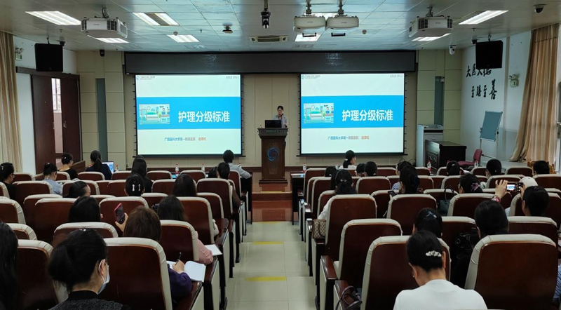 3月28日下午,我院护理部在临床教学大楼二楼多功能厅召开护理管理专题培训。护理部主任杨丽、副主任韦琴、曾国艳以及全院护士长约120人参加,会议由护理部主任杨丽主持。