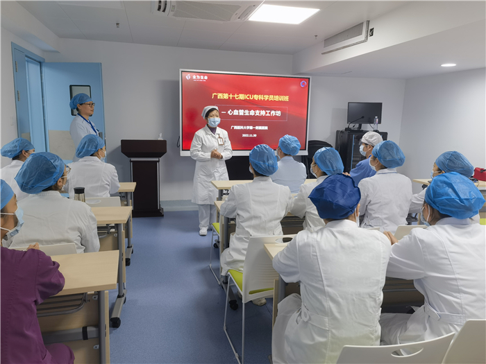 11月30日下午,广西第十七期ICU专科护士培训班在护理临床技能中心开展心血管生命支持工作坊。ICU专科护士学员、儿科片区科护士长李艳青、重症医学科二病区护士长黄德斌、EICU护士长钟娟以及护理骨干、进修护士参加, EICU专科护士带教老师屈敬婷主持。