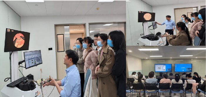 妇产科专业基地指导医师植枝福、何中慧、杨文梅、周卓琳及迟博进行宫内疾病的理论授课并考核,课程内容涵盖宫腔镜技术的发展应用、常见疾病的诊治规范、并发症的防治等。在宫腔镜技术操作中,采用宫腔镜虚拟训练系统进行,为学员们提供了逼真的临床体验,同时更好地模拟实境,训练学员宫腔镜基本操作技能和处理紧急情况的应变能力。