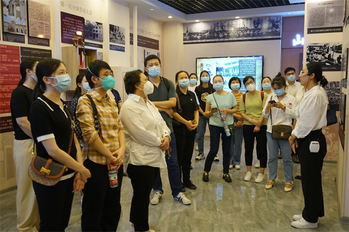 大家在讲解员的带领下,缓步走进体验馆党史发展区。一段段详实的文字、一幅幅珍贵的图片映入眼帘,大家重温了1919年至1949年那段波澜壮阔的党史工运史。