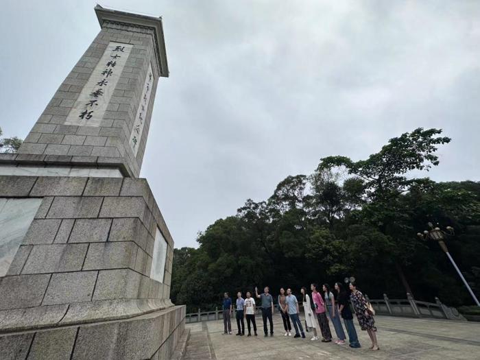 步入横州公园,爬上斜坡走廊,革命烈士纪念碑巍然矗立眼前。在纪念碑下,全体党员、团员们整齐列队,向革命烈士默哀。吴向华为全体党员及团员详细讲解了横州革命的历史。
