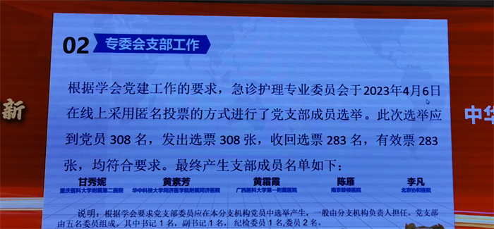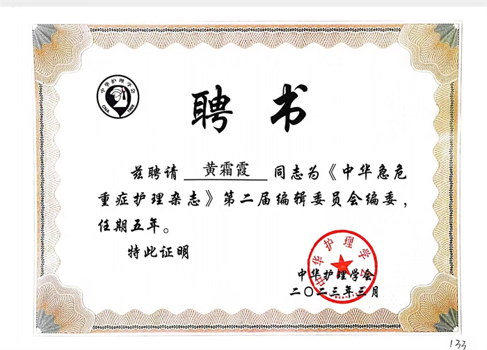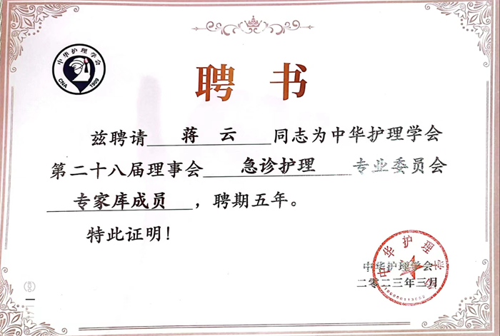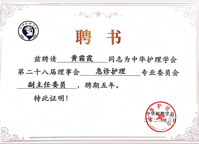 会上,门急诊片区总护士长黄霜霞继续获聘为中华护理学会第二十八届理事会急诊护理专业委员会副主任委员及《中华急危重症护理杂志》第二届编辑委员会编委,并被推选为中华护理学会急诊护理专业委员会党支部成员;急诊科副护士长蒋云获聘专家库成员。