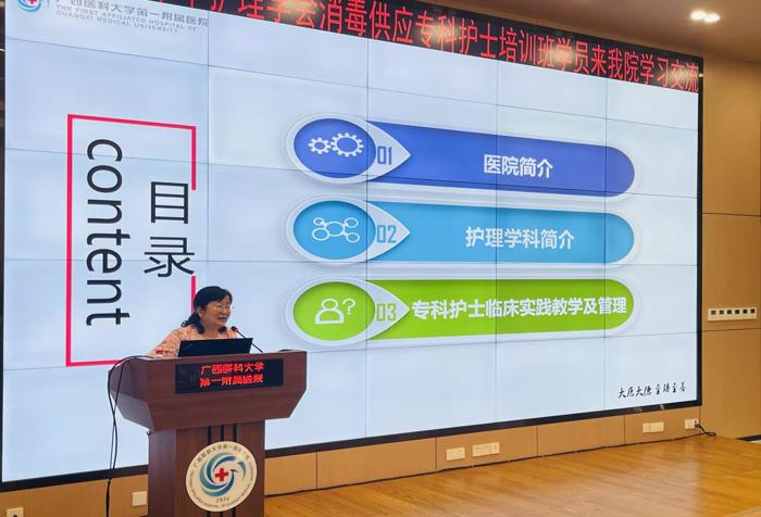 韦琴主持并介绍医院和护理学科概况、专科护士临床实践教学及管理等内容,希望学员按照培训计划和学员手册要求,完成实践学习任务,提高消毒供应专科工作能力。