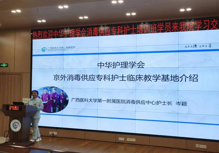 岑颖汇报了基地概况、我院消毒供应专科的优势、师资力量及教学计划等内容。她将带领全体老师为学员们传道授业解惑,希望老师和学员能教学相长,共同完成培训计划。