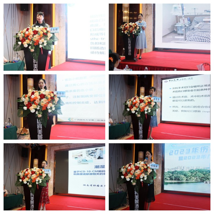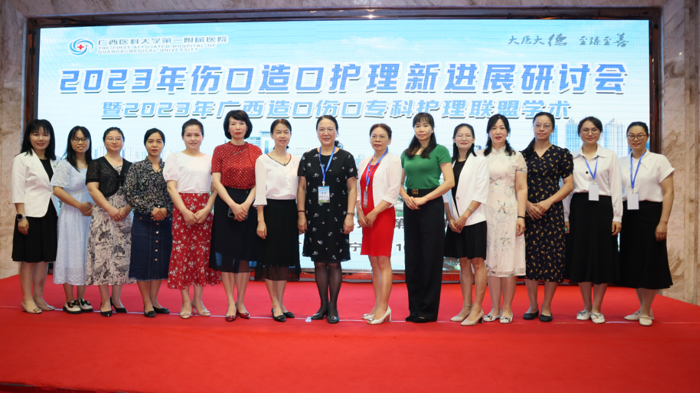 开幕式还特别邀请到中南大学湘雅医院造口伤口失禁专科门诊护士长张其健、湖南省肿瘤医院伤口造口失禁护理中心护士长朱小妹、我院神经内科科护士长赵翠松、结直肠肛门外科护士长韦瑞丽参加。在两天的授课中,应燕萍、张其健、朱小妹、韦瑞丽、中山大学附属第三医院护理部主任胡爱玲、中山大学附属第一医院伤口造口失禁专科门诊黄漫容主任护师、赵翠松、我院结直肠肛门外科副主任医师廖存、广西医科大学附属肿瘤医院结直肠肛门病区护士长左红群、广西区人民医院胃肠疝肠瘘外科护士长陈德凤、广西医科大学第二附属医院骨科护士长韩丹丹分别进行了题为《以目标管理为抓手,精准防控压力性损伤》《造口皮肤黏膜分离护理策略》《潮湿相关性皮肤损伤的临床扩展实践》《藻酸盐银离子在肛瘘创面愈合的效果研究》《2022年国际伤口感染共识解读》《腹部切口感染的护理》《失禁患者的皮肤管理》《造口还纳手术切口感染与预防》《回肠造口还纳术的围手术期管理》《腹部手术后肠瘘伤口处理》《PRP在创面中的应用》的精彩授课,紧密围绕人才培养、专业发展、护理科研、智慧化建设、质量提升等内容进行分享,并共同探讨伤口造口护理的前进方向。