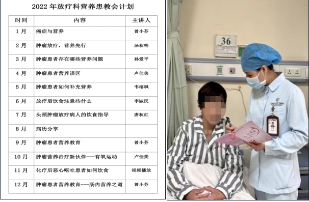 2022年,放疗科成立全方面营养治疗支持小组,设立“医护药”协同作战的组织架构,营养医师、临床药师负责入院患者的营养诊疗,营养护师、护士骨干负责营养教育、营养随访等工作,带头人、临床药师对临床营养工作进行质量控制。在流程管理上,学科建立了肿瘤患者从入院到出院、接受放疗前中后全程营养管理制度和临床路径,基于对患者营养状况的全面筛查评估,依据五阶梯原则动态调整营养治疗策略,综合运用“互联网+医疗护理”线上线下多模式开展患者营养健康教育、营养指导及随访。在团队建设及科研方面,学科紧跟行业前沿,通过系列专题培训加强肿瘤营养治疗团队建设,同时认真总结临床干预数据,积极开展科学研究。