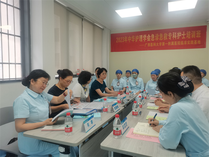 我院护理部主任杨丽、副主任韦琴、基地负责人黄霜霞、基地导师及全体急诊急救专科班学员参加迎检。韦琴主持督导汇报会。