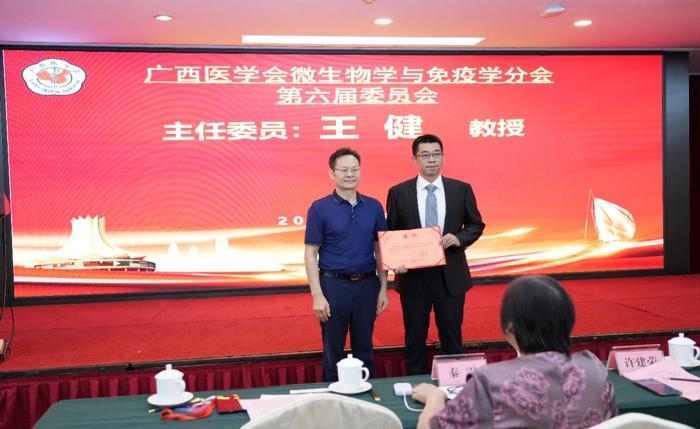 广西医学会秘书长许建荣主持换届改选会。会议选举产生了广西医学会微生物学与免疫学分会第六届委员112名,我院医学检验技术专业负责人秦雪教授当选名誉主任委员,检验科副主任王健当选主任委员,梁宏洁、李晞当选常务委员,李萌、齐运伟(兼秘书)当选委员。王健感谢大家的信任和支持,并从建平台、强培训、促交流、多中心临床研究等方面介绍了分会工作计划,表示将履行职责,集思广益,服务好全体委员,共同推动分会在新时代新征程上扬帆远航。