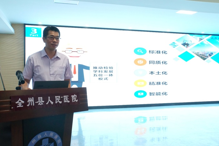 我院检验科副主任、广西医学会微生物学与免疫学分会主任委员王健介绍了我院医学检验技术走基层活动的发展历程,强调了检验学科“标准化、同质化、本土化、精准化、智能化”五位一体模式的发展目标。