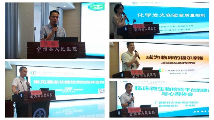 7月14日,我院检验科牵头联合广西医科大学其他直属附属医院检验科一行7人到桂林市全州县,开展“医学检验技术对口帮扶基层行”暨广西医学会“党旗领航——千名学会专家走基层”活动。全州县人民医院副院长董建国及县区各级医疗机构临床与检验技术人员100余人参加培训。