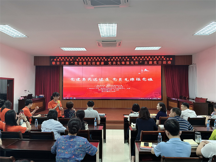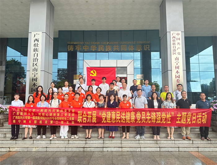 7月20日下午,我院内科第四党支部、心研所第三党支部、内科学专业型研究生第二党支部联合南宁树木园机关第二党支部,到南宁树木园开展“党建惠民送健康 党员先锋强党性”主题党日活动。双方支部党员、党外知识分子等共51人参加。