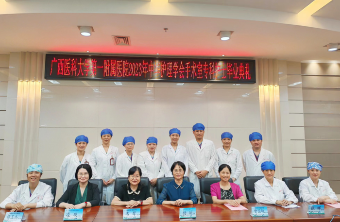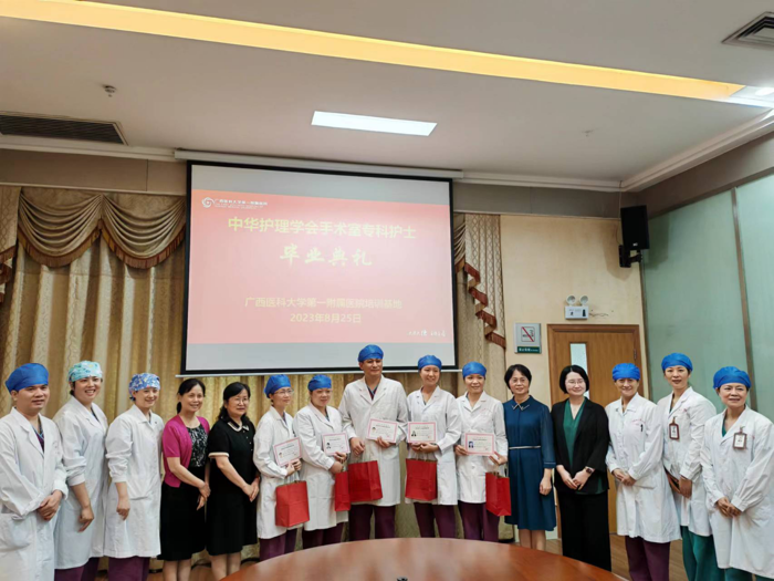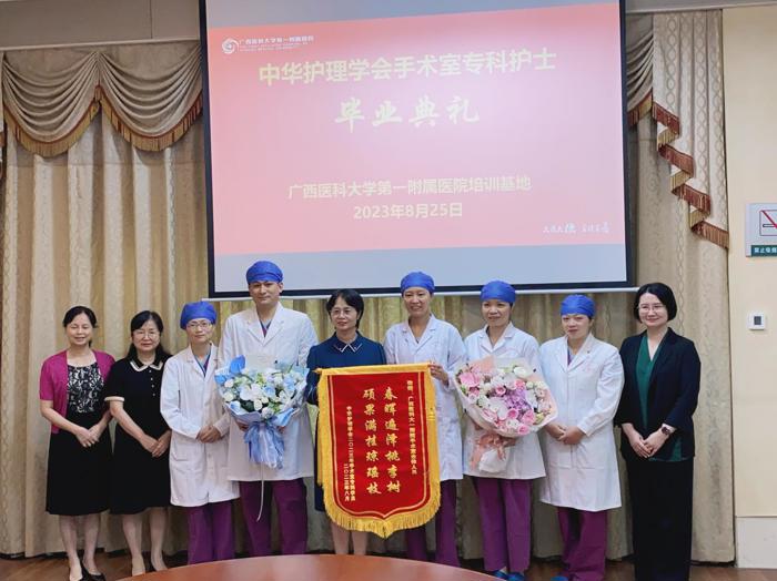 8月25日,我院在住院部裙楼二楼小学术厅举行2023年中华护理学会手术室专科护士培训班毕业典礼。护理部主任杨丽,副主任韦琴、曾国艳、凌瑛,手术室副护士长张晖,陈育慧副主任护师、杨玉杰总带教老师、临床带教老师及5名结业学员参加。张晖主持。
