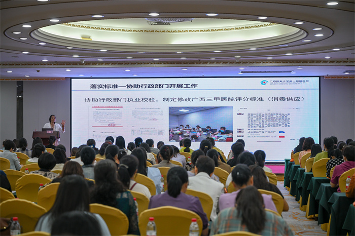 国家卫生健康委医院管理研究所副研究员周彬、原首都医科大学附属北京友谊医院袁园主任护师、解放军总医院第七医学中心李爱琴副主任护师、西安交通大学第二附属医院司慧君副主任护师、原江西省人民医院李淑玲主任护师、中山大学附属第一医院杜合英主任护师、广西壮族自治区人民医院蒋松云护士长及我院岑颖护士长等区内外消毒供应学科专家,分别就贯彻落实行业标准、医院感染管理与消毒供应中心质量控制、质量指标创新、消毒供应质控指标在质量评价与管理中的运用、消毒供应质控指标的难点与对策及消毒供应质控指标评价过程质量的科学方法等内容进行专题报告。