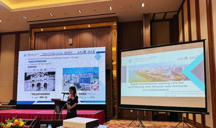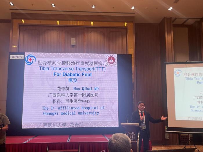 在研讨会上,花奇凯就“胫骨横向骨搬移治疗糖尿病足”、江华就“椎间盘髓核融合的内镜治疗”、陆荣斌就“应用手术机器人和导航技术微创治疗股骨颈骨折”、韦苏怡就“一位百岁老人的快速康复护理”等专题内容分别进行分享,与会国际同行对我院骨科团队的汇报内容给予高度评价,尤其我院糖尿病足的诊疗新技术引起了专家们的极大关注。骨科团队并观摩了本届研讨会欧美专家的手术直播,就专业技能进行深入探讨。