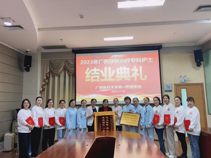 11月29日上午,我院在住院部裙楼二楼小学术厅举行广西第六期静脉治疗专科护士培训临床实践结业典礼。护理部副主任韦琴,神经内科片区科护士长赵翠松,肿瘤内科一病区护士长兼基地负责人陈国连、神经内科一病区护士长滕海英、消化内科一病区护士长莫焱、干细胞移植中心护士长周雪梅、新生儿科护士长梁洁,基地临床带教老师及全体学员参加。陈国连主持。