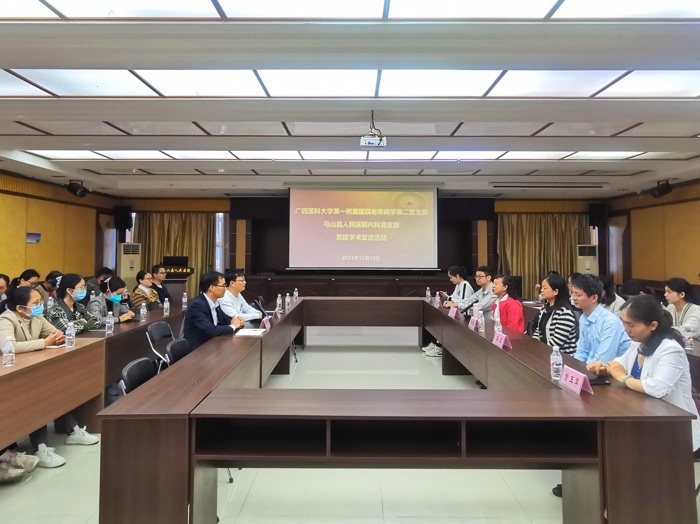 12月10日,在支部书记、老年内分泌代谢科主任梁敏的带领下,我院老年病学科第二党支部党员一行到我院马山分院(马山县人民医院)开展党建交流活动。