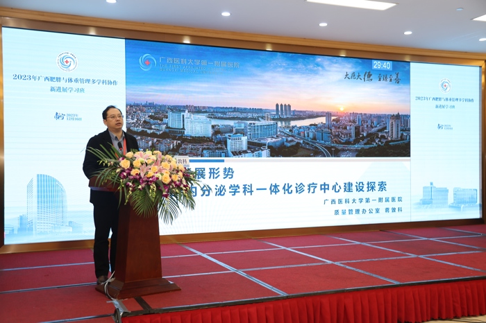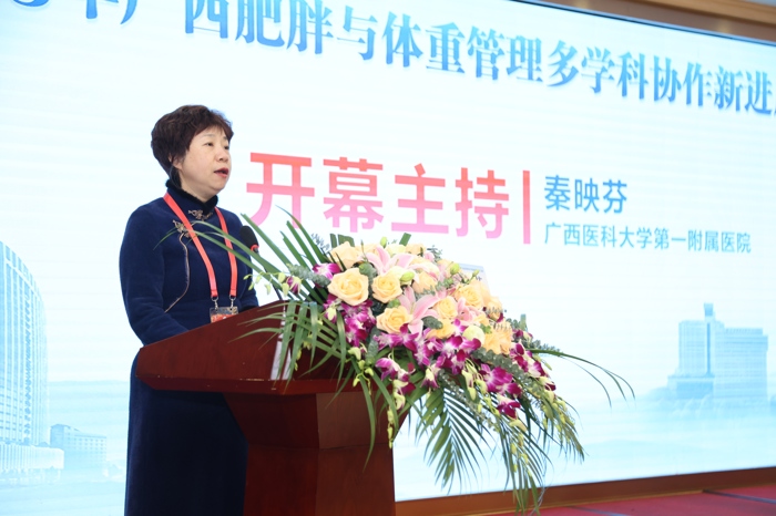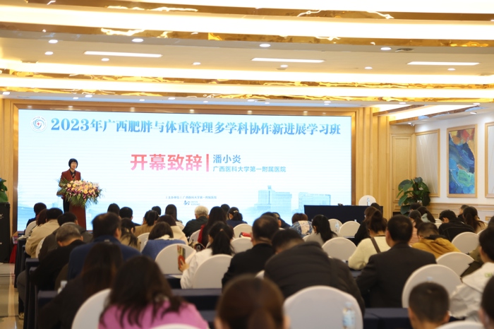 我院副院长潘小炎,院内分泌科主任秦映芬教授、副主任梁杏欢教授等出席会议并致辞。潘小炎对本次学习班的顺利召开表示祝贺,并介绍了我院设立肥胖症一体化诊治中心的背景,以及开诊至今所取得的成就。希望能通过本次学习班,加强肥胖多学科交流学习,共同探讨肥胖的新进展、新理念和新技术,为我区肥胖防控控制作出贡献。