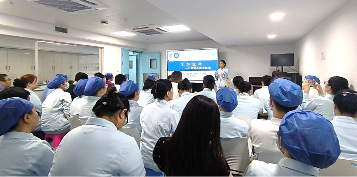 培训伊始,韦琴对急诊急救小组及气道管理小组工作所取得的成绩表示肯定,并赞扬本次急诊急救知识技能培训采取理论授课结合情景模拟的灵活方式。急诊科护士长黄翠青进行《心肺复苏指南》授课,围绕最新指南讲解心肺复苏相关技能要点;急诊科杨智作《气管插管的配合》课程培训,讲解初级人工气道与高级人工气道的建立,并示范紧急情况下如何配合气管插管。