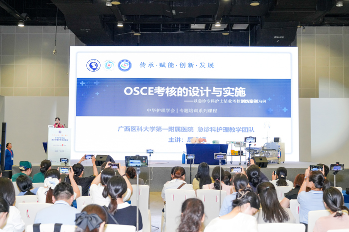 在急诊专科护士OSCE客观结构化评价考核模式展示分会场,我院与重庆医科大学附属第二医院作为示范单位,同台进行了标准化考核案例示范。我院以创伤案例为蓝本,完整地呈现了OSCE考前、考中、考后全流程标准化的培训与考核路径。