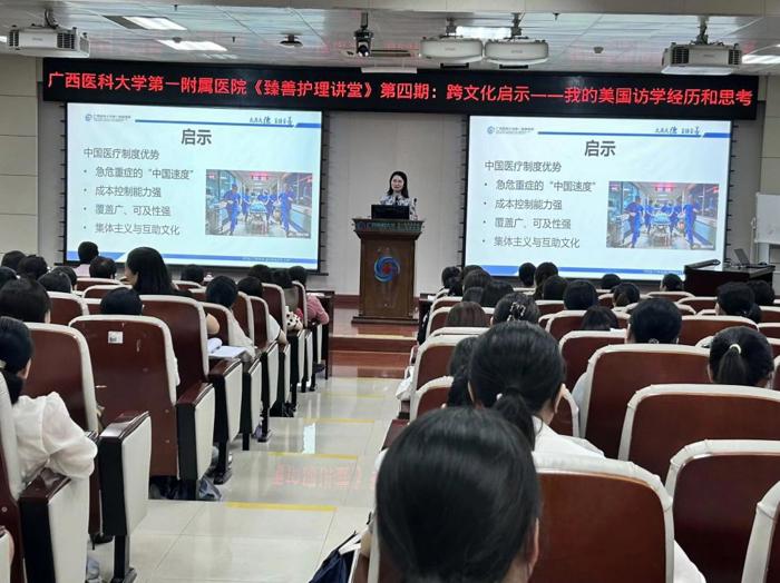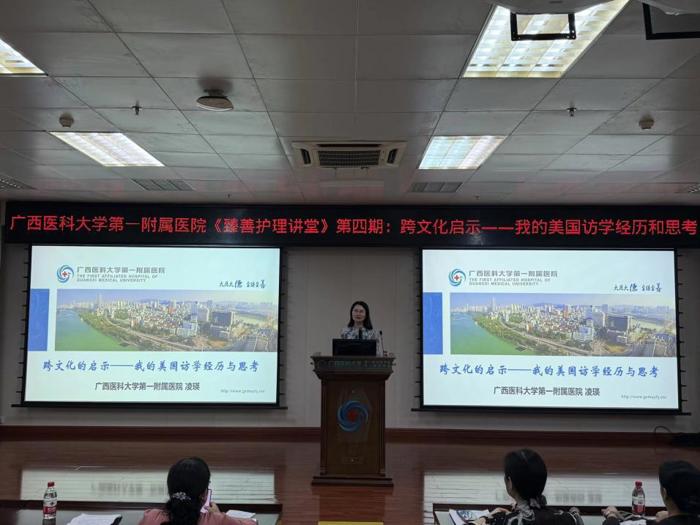 9月25日下午,我院在临床教学大楼多功能报告厅举行《臻善护理讲堂》第四期“跨文化的启示——我的美国访学经历与思考”主题讲座。本期讲堂以访学经验分享为主题,由护理部副主任凌瑛主讲,各科室护士长、护理骨干150余人参加,护理部副主任游雪梅主持。