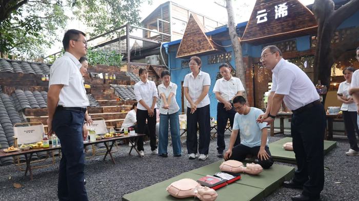 急救技能实操培训中,支部党员凌国兴医生利用携带的心肺复苏模拟人,进行专业、规范的操作演示,详细演示并讲解了心肺复苏(CPR)与自动体外除颤器AED的标准操作流程及每一步的关键要点与注意事项。在医护人员“手把手”指导下,企业职工利用模拟人进行心肺复苏练习与AED使用演练,不仅掌握了基本的急救技能,也增强了在科学应对突发心脏事件的意识、信心与能力。