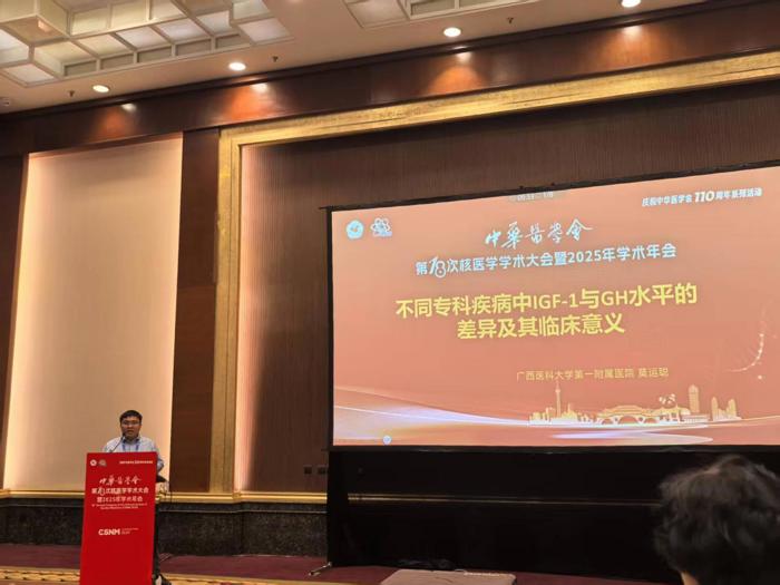 我院核医学科青年学者同样在大会上崭露头角。韦海莲在治疗学组做了《90Sr敷贴治疗特殊部位婴幼儿血管瘤的临床疗效分析》的口头交流,主要分享90Sr敷贴为特殊部位婴幼儿血管瘤治疗提供的新依据,明确低月龄、小病灶的治疗效果,为临床方案制定提供关键参考,助力特殊部位血管瘤患儿诊疗;莫运聪在体外分析学组做了《不同专科疾病中IGF-1与GH水平的差异及其临床意义》的口头交流,主要分享在 GH/IGF-1 轴相关研究多聚焦于矮小症、肢端肥大症等单一疾病下,该研究另辟蹊径,以性别、年龄、疾病类型为三维分析维度,结合多专科大样本数据展开探索,为临床解读激素水平差异提供了全新视角,深入探讨其临床价值与实践意义。
