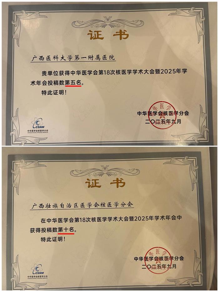 据了解,作为广西地区主委单位,我院充分发挥引领作用,积极统筹、鼓励学者踊跃投稿,最终带领广西核医学在全国投稿量排名中脱颖而出,荣获全国投稿数第10名(按省份排名)以及我院荣获全国投稿数第5名(按单位排名)。