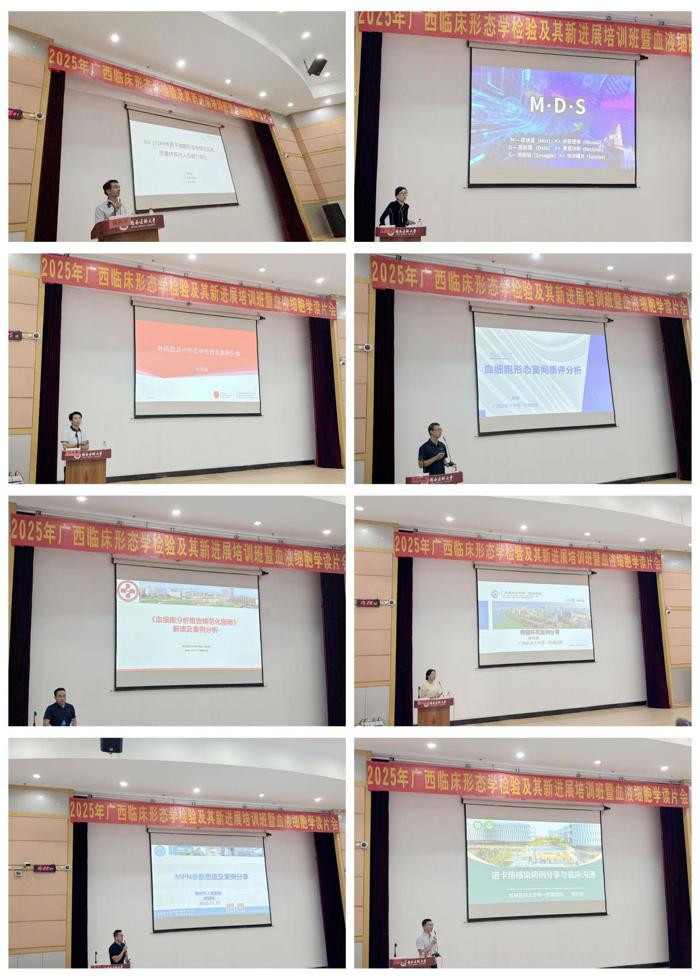 理论学习环节,广东省中医医院陈炜烨副主任技师、陆军军医大学第一附属医院的黄兴琴副主任技师、上海市闸新中西医结合医院的付兆强副主任技师、南方医科大学南方医院的何永建副主任技师,我院杨峥副主任技师、黄春妮主任技师,柳州市人民医院的谢祖林副主任技师、桂林医科大学第一附属医院的何松哲博士受邀莅临指导,分别围绕ISO 15189体系下细胞形态学检查的规范实践、骨髓增生异常综合征(MDS)的综合诊断要点和临床实践经验、外周血涂片形态学检查的技巧和要点、外周血异常结果规范化报告、全国血细胞形态学室间质评标准要点及增减变化、骨髓坏死案例分析、骨髓增殖性肿瘤(MPN)的诊断思路、诺卡菌感染病例的诊疗经验及临床沟通的实用技巧等内容进行专题授课,帮助学员们拓展学术视野、更新工作理念、提升业务水平。