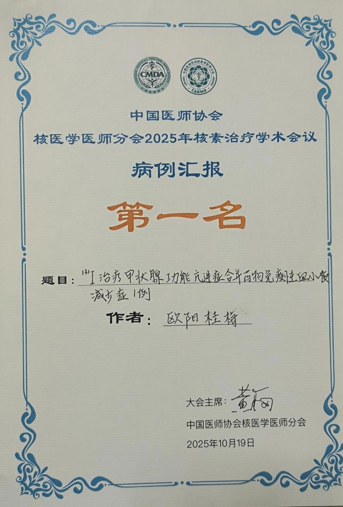 10月17日至19日,由中国医师协会核医学医师分会主办、华中科技大学同济医学院附属协和医院承办的“2025年核素治疗学术会议”在武汉召开。我院核医学科在本次会议中获得重要荣誉:学科带头人韦智晓主任受邀担任大会核心学术环节主持;欧阳桂梅凭借《碘-131治疗甲状腺功能亢进症合并药物免疫性血小板减少症1例》的临床报告,从全国16位参赛选手中脱颖而出,获得全国第一名。