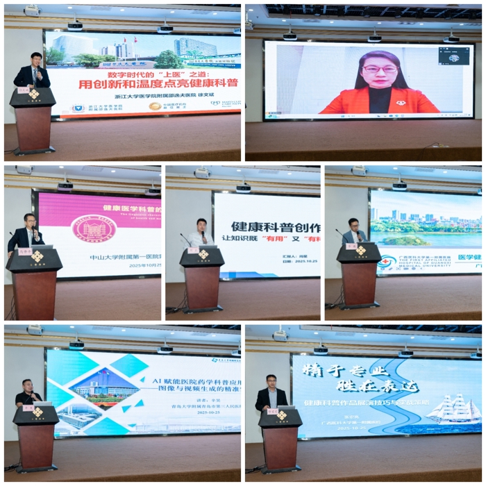 浙江大学医学院附属邵逸夫医院徐文斌副主任医师,中国医师协会健康传播工作委员会常务副主委兼秘书长施琳玲,中山大学附属第一医院马晋平主任医师,广西壮族自治区民族医院周星副主任医师,广西医科大学第一附属医院李萌主任技师,青岛大学附属青岛市第三人民医院辛昊主管药师,广西医科大学大学第一附属医院张宏亮主任药师等区内外知名专家,先后分别以《数字时代的“上医”之道》《AI时代的健康科普新实践与新趋势》《健康医学科普的语言特点和应用场景》《健康科普创作:让知识既“有用”,又“有料”!》《医学健康科普创作实践与经验分享》《AI点亮科普之光——图与视频的精准实践》《健康科普作品展演技巧与实战策略》为题进行授课。