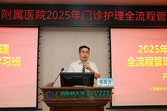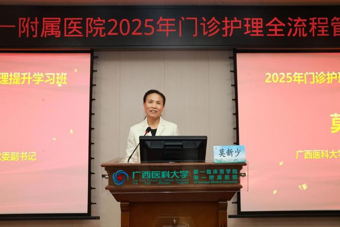 我院党委副书记莫新少出席开班式并致辞。她回顾了我院门诊护理工作的举措和成效,强调了作为窗口部门的门诊护理工作在医疗服务中的重要性。希望以学习班为契机,共同促进广西门诊护理管理的规范化、精细化、智慧化与人性化发展,为患者提供更优质高效的门诊护理服务,不断改善就医感受,提升患者体验。门诊办公室负责人陈国力主持开班式。