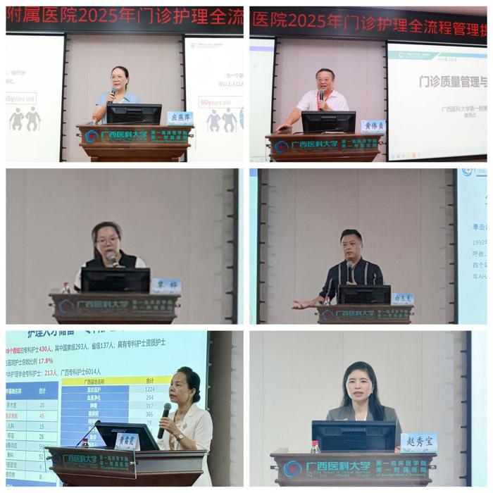 学习班邀请了我院广西护理质控中心主任应燕萍教授,我院门诊办公室原主任黄伟贞主任医师、我院急诊科副主任白玉龙副主任医师、医院质量管理办公室覃桦副主任医师、门/急诊片总护士长黄霜霞主任护师、全科医学科护士长赵秀宝副主任护师,门诊办公室副主任黄玉副主任护师,副护士长李弘、黄元琦副主任护师及广西医科大学第二附属医院科研部张桂宁副主任护师、耳鼻咽喉头颈外科护士长潘晓副主任护师等区内多位资深专家莅临授课指导,内容涵盖了门诊质量控制、老年护理、一体化诊治中心建设、心肺复苏、专科护士培养等多个关键领域,为学员们带来了一场知识盛宴,专家们特别强调了人文关怀在门诊护理中的核心地位,从不同角度阐述如何在门诊患者诊治全流程中融入人文关怀,提升患者的就医体验与满意度。