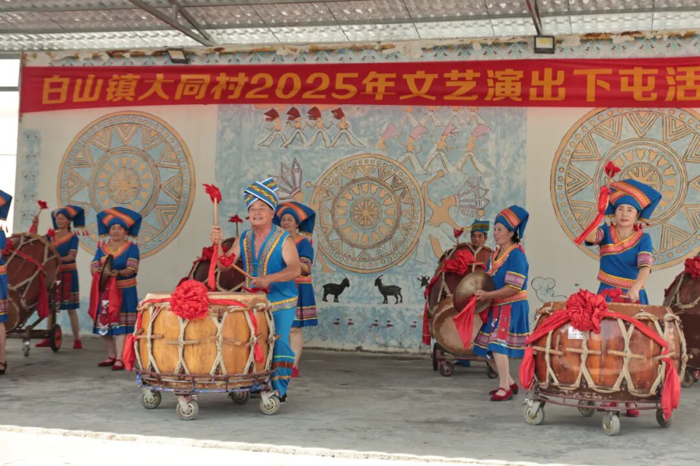 在马山县文旅局的支持下,国家级非物质文化遗产——壮族会鼓表演团队为村民和师生们带来了一场酣畅淋漓的表演。