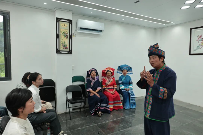成员们欣赏了三位非遗传承人演唱的《南蛮欢》《壮家乐》等曲目。歌声悠扬动听,和声和谐美妙,让成员们陶醉其中。随后,团队成员就三声部民歌的艺术价值与社会功能、传承与面临挑战等问题采访了三声部民歌第四代传人温建业。