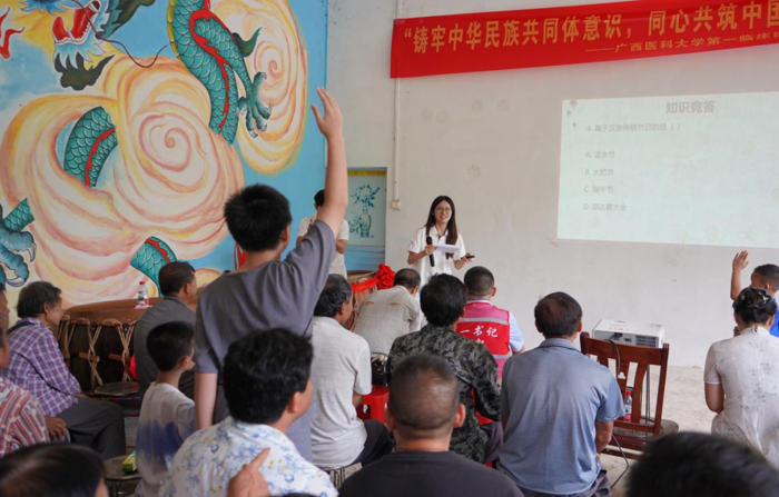 马山县是多民族聚居地,博士团注重开展“铸牢中华民族共同体意识”理论宣讲和非物质文化遗产研学活动,深入了解体验两项国家级非遗——壮族会鼓和壮族三声部民歌的传承与发展,把“非遗”搬进医学人文课堂。