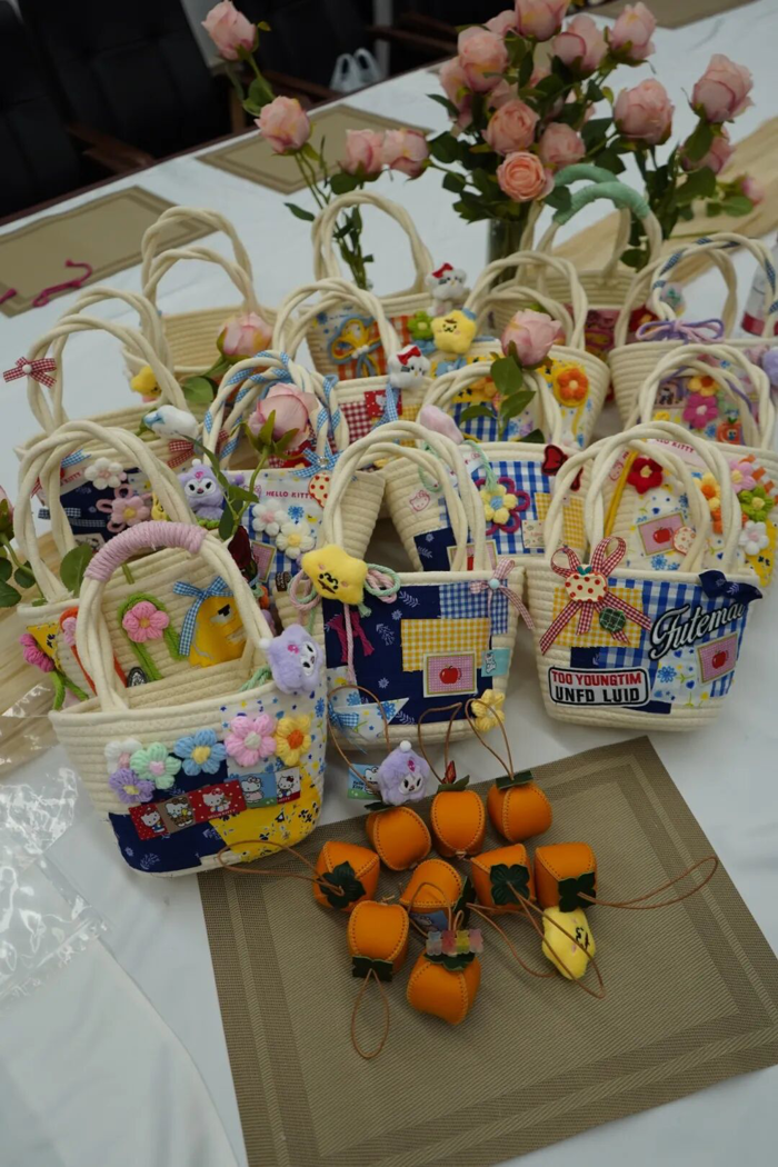 全体成员纷纷展现手工创作成果,柿柿如意挂件和DIY手提包摆满了桌子,每个人都在兴奋地分享自己的制作思路。