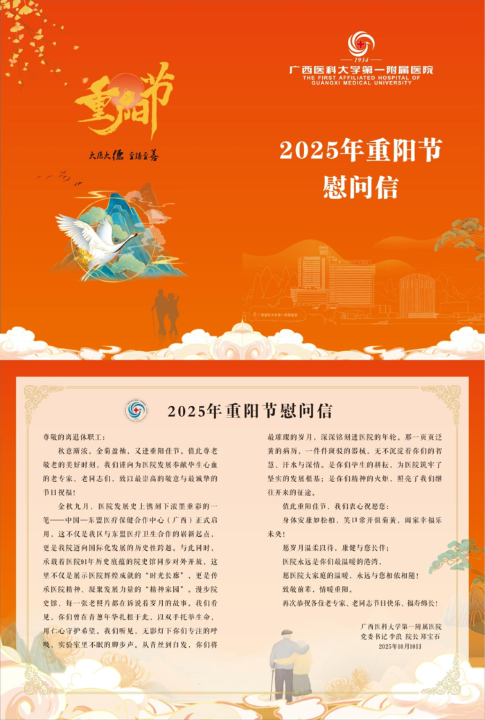 金秋送爽,丹桂飘香。为弘扬敬老爱老的医院文化,在重阳节来临之际,我院党委书记李浪、院长郑宝石等院领导率队,开展2025年重阳节走访慰问离退休职工活动,每一位高龄老同志带来全院职工的浓浓暖意。我院离退休职工管理办公室还特别组织老同志们重返医院,参观新建成开馆的院史馆,共忆峥嵘岁月,共话医院发展。
