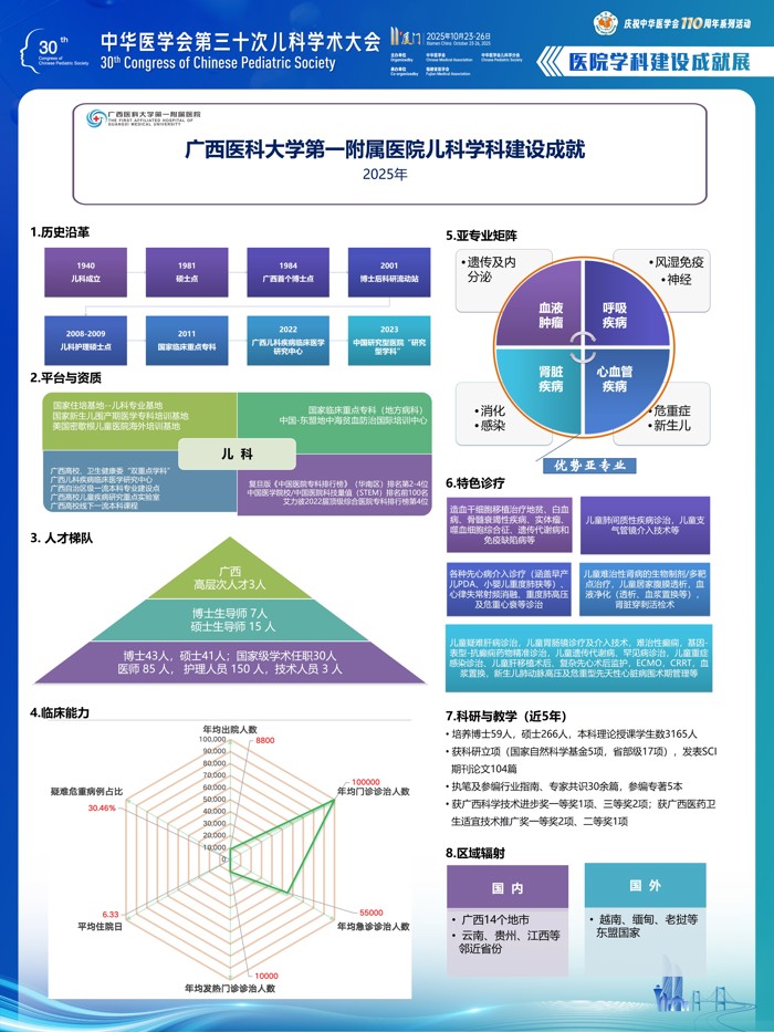 本次大会上的优秀表现,是我院儿科长期坚持“以患儿为中心”、持续推进学科内涵建设的集中体现。未来,学科将继续深化国内外学术合作,加快新技术引进与青年医师成长步伐,进一步巩固学科在广西儿科领域的引领地位,为推动西南地区儿童健康事业高质量发展贡献更大力量。