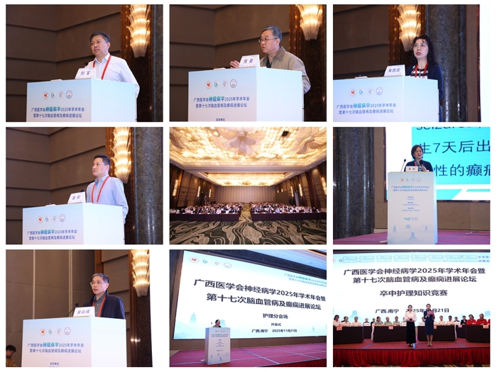 11月20日至22日,由广西医学会主办、广西医学会神经病学分会承办、我院协办的广西医学会神经病学2025年学术年会暨第十七次脑血管病及癫痫进展论坛在南宁成功举办。会议汇聚了国内神经病学领域的众多知名专家学者,通过主旨报告、专题论坛、病例讨论及护理论坛等多种形式,围绕脑血管病、癫痫、神经变性疾病、神经免疫、神经介入、神经护理等热点领域进行了深入而广泛的学术交流,全面展现了神经病学领域的最新研究进展与临床实践成果。