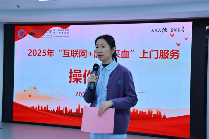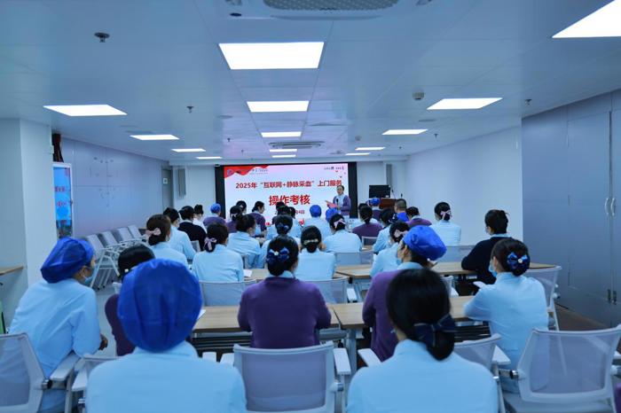 为夯实“互联网+静脉采血”上门服务人力储备,满足与日俱增的“互联网+静脉采血”社会需求,12月4日上午,我院护理部在急诊科负一楼教室举行2025年“互联网+静脉采血”第二期岗前培训。护理部主任游雪梅、副主任凌瑛,神经内科片区科护士长赵翠松,急诊科护士长黄翠青、副护士长黄春艳,EICU护士长钟娟、急诊内科病区护士长屈敬婷、急诊输液室护士长吴圆春、儿科二病区护士长杨少丽、互联网医院运营部王昕云及“互联网+静脉采血”上门服务操作考核人员50余人参加,赵翠松主持。