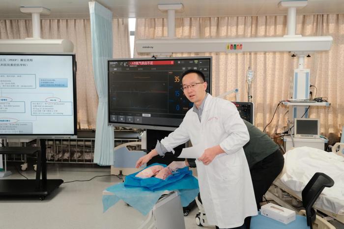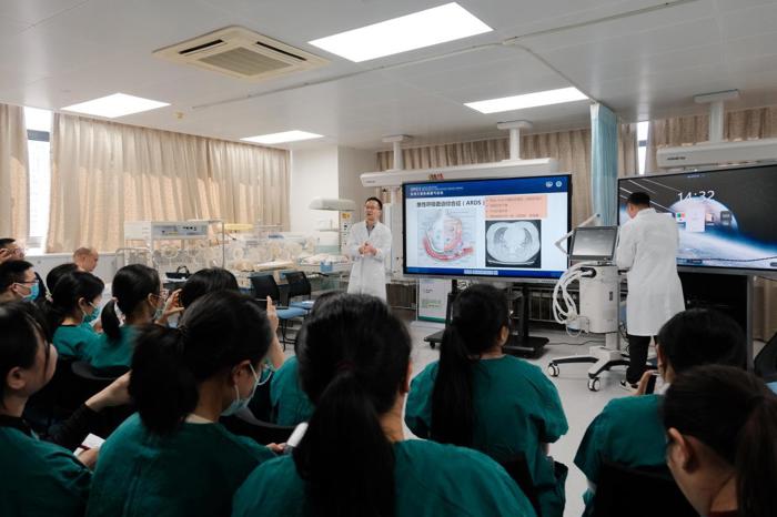 实操练习环节中,学员们分为三组同步开展实训。杨志勇主任医师、梁秀安主任医师、陈峋副主任医师等多位导师现场指导,学员们分组练习呼吸机管路连接、自检操作,熟悉呼吸机界面及功能按钮,并针对肺部正常、肺炎、哮喘持续状态等常见疾病状态,进行呼吸机参数初始设置的模拟实训,将理论知识转化为实操技能。来自复旦大学附属儿科医院的陶金好教授带来《ARDS 的肺复张、PEEP 滴定》专题分享,通过理论讲解与猪肺模拟演示相结合的方式,深入浅出地解析了相关核心技术,为学员们带来前沿的临床经验与诊疗思路。杨志勇主任医师针对《呼吸机波形识别》,详细讲解常见人机对抗波形的识别与处理方法;陈峋副主任医师则围绕常见报警的识别与处理展开授课,帮助学员们提升应对临床突发情况的处置能力。