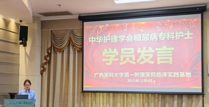 12月4日下午,我院在住院部裙楼二楼小学术厅举办 2025年中华护理学会糖尿病专科护士培训班“线上+线下” 毕业典礼。护理部主任游雪梅、副主任韦琴、凌瑛、董雪云、黄德斌,老年医学科、大内科、内分泌科、老年医学内分泌代谢科各科护士长,教学顾问、总带教老师、临床带教老师代表及全体糖尿病专科护士学员参加。基地负责人/内分泌科护士长游越西主持。